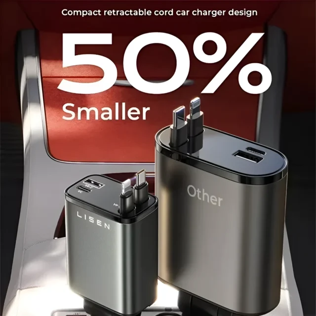 • Retractable Design – Keep your car tidy and organized with the convenient two-line single-pull retractable feature. No more tangled cables to deal with!