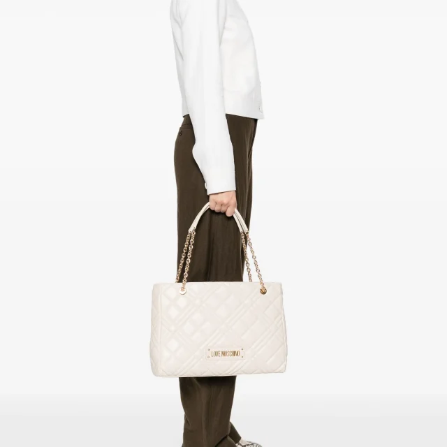 Step up your style game with the Love Moschino Milk White Logo Lettering Quilted Tote Bag. Order yours today and add a touch of luxury to your everyday look!