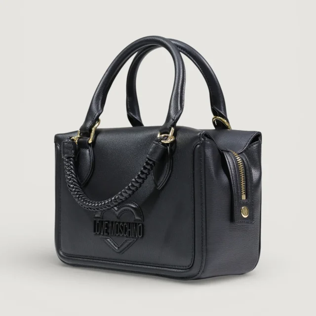 Made from 100% polyurethane, the bag boasts a soft yet durable texture that ensures long-lasting use and easy maintenance. The black hue offers a timeless appeal, making it easy to pair with any outfit, while the embossed Love Moschino logo and the braided handle add a unique touch that’s sure to catch eyes.