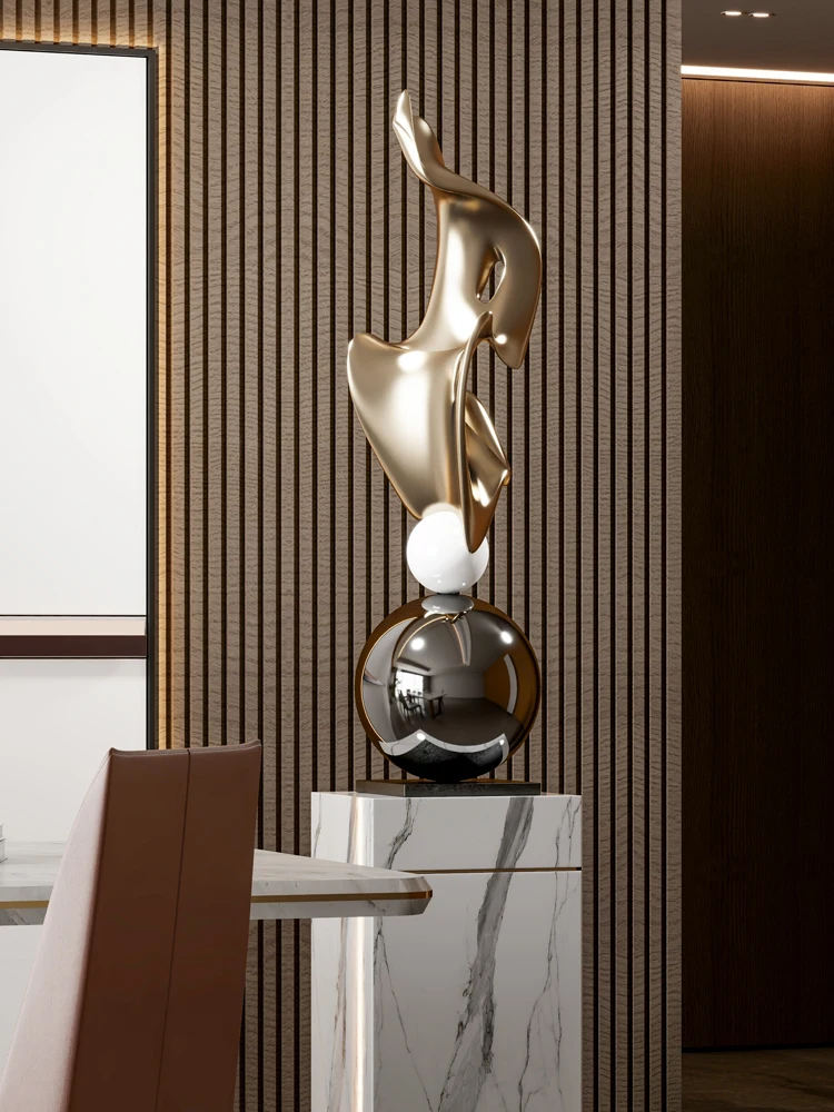 Whether you’re designing a model room, curating a gallery-style living area, or refining the look of a high-end lobby, this electroplated geometric sculpture embodies the perfect balance of art and sophistication. Its elegant form captures light beautifully, creating a refined atmosphere that speaks of taste and modern luxury.