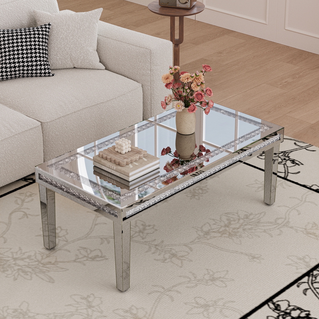 The standout feature is the luxurious crushed diamond inlay that frames the table. This detail adds texture, sparkle, and a premium feel that standard coffee tables simply don’t offer. Combined with the reflective silver finish, the table creates a striking visual effect that blends modern style with timeless elegance.