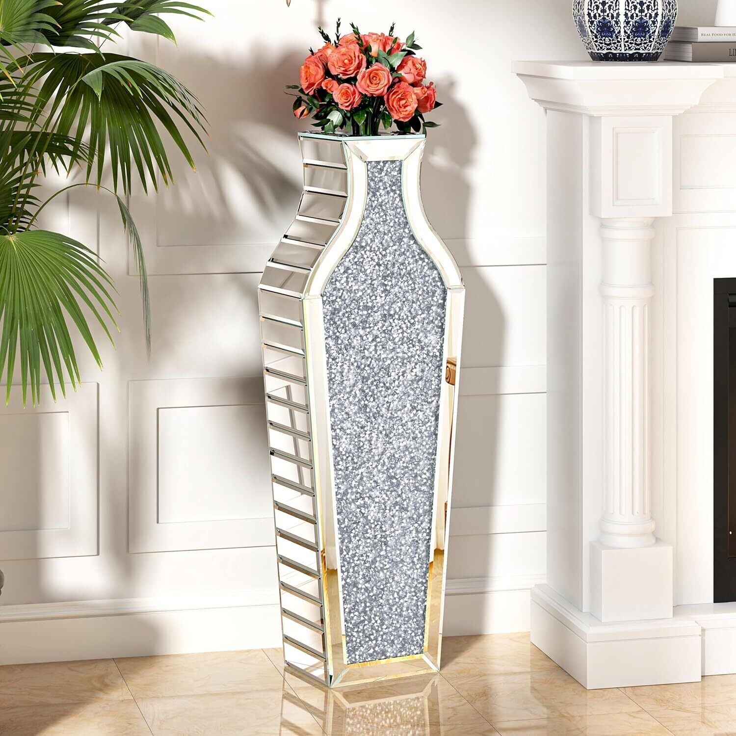 Transform your home decor with our Luxury 27-Inch Tall Floor Vase, a stunning piece that blends artistic design with elegant sophistication. Adorned with intricate crushed diamond inlays, this mirrored vase captures and reflects light beautifully, creating a sparkling centerpiece that enhances any room. Its tall stature makes it perfect for showcasing dramatic floral arrangements or can be used alone for a striking statement.