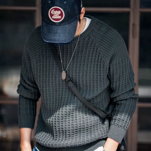 Men’s Autumn Waffle Knit Crewneck Sweater – Casual Loose Fit Pullover