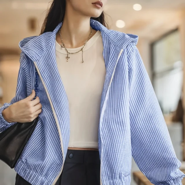 Step into easy, breezy style with this blue and white striped hooded shirt designed for women who love comfort with a polished touch. Made from a soft cotton and polyester blend, this top has a light 122g per square meter fabric weight that feels airy without being flimsy. The subtle seersucker texture adds a fresh, relaxed vibe while the loose fit keeps your movement free and comfortable all day.