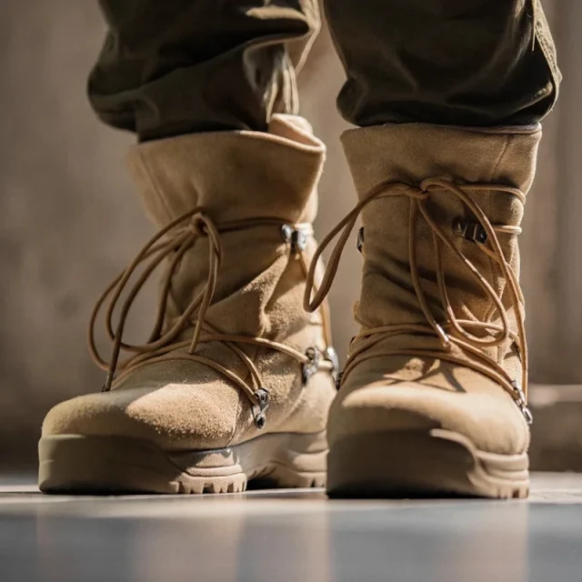 These high-top boots feature a mountaineering-inspired lace-up system that allows for customizable strapping—so you can adjust the fit your way. The suede upper provides a natural, weathered texture, giving every step a sense of confidence and vintage appeal. Breathable mesh lining ensures comfort even on long days, while the tough rubber outsole offers powerful traction on rough or uneven terrain. Whether you’re hiking, working outdoors, or stepping out in rugged style, these boots are made to perform.