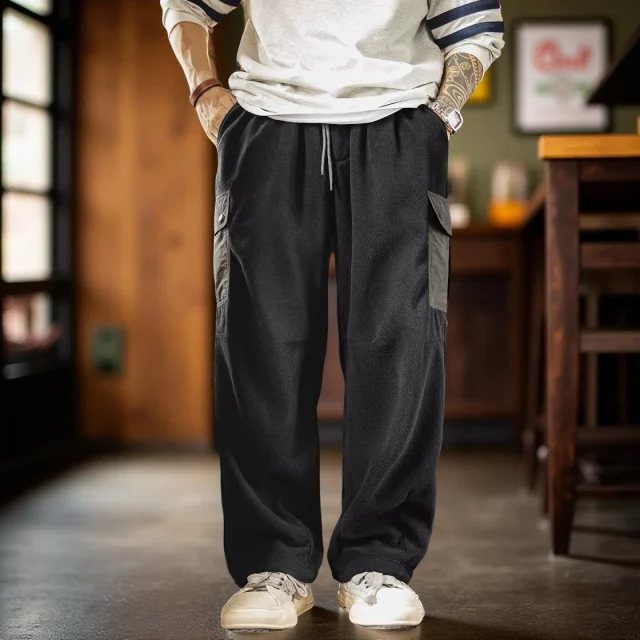 These pants are made with thick fleece fabric that traps heat while staying breathable. The inside is brushed for extra softness, giving you that warm, cozy feeling the moment you put them on. The loose fit allows easy movement, while the cuffed hems and toggle drawcord add a stylish, functional finish. They blend comfort, casual style, and cold-weather performance into one essential piece.