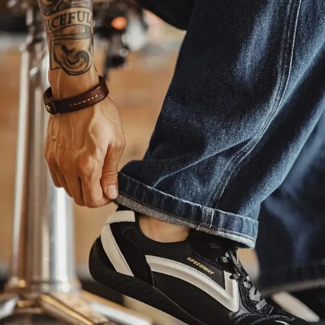 Step into timeless style with these retro patchwork racing sneakers designed for men who value comfort and character. Inspired by classic European track shoes, this pair blends old-school racing attitude with a clean, modern look made for daily wear. The low-profile silhouette feels light on the foot, while bold side details and layered textures add just the right amount of edge. Whether you are heading out for a casual day, a city walk, or a relaxed winter outing, these sneakers bring effortless style to every step.