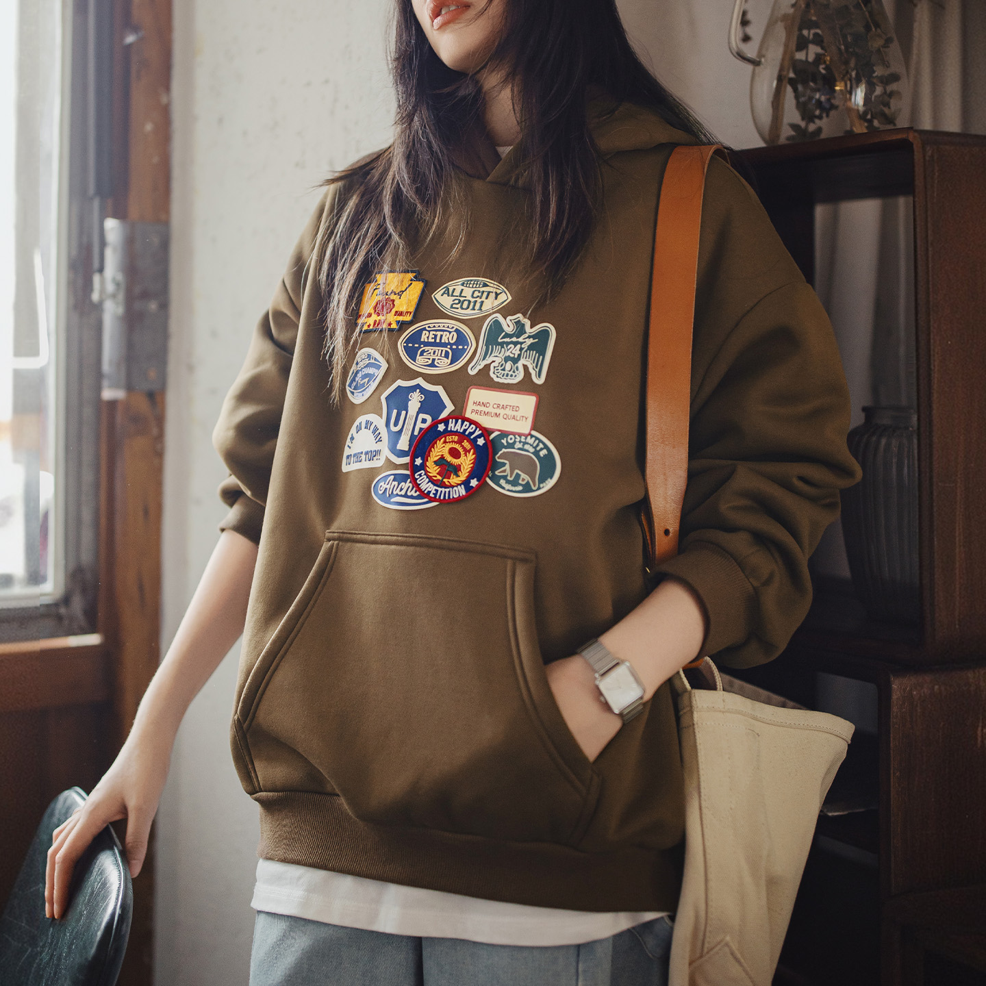 Meet your new go-to hoodie for the winter season. This loose fit fleece sweatshirt blends timeless American street style with modern comfort, creating a look that feels effortless and confident. Made for women who love warmth without sacrificing style, it features a vintage badge embroidery that adds a subtle but bold character to your everyday outfits. The rich brown color makes it easy to match with jeans, joggers, or leggings, giving you endless styling options.