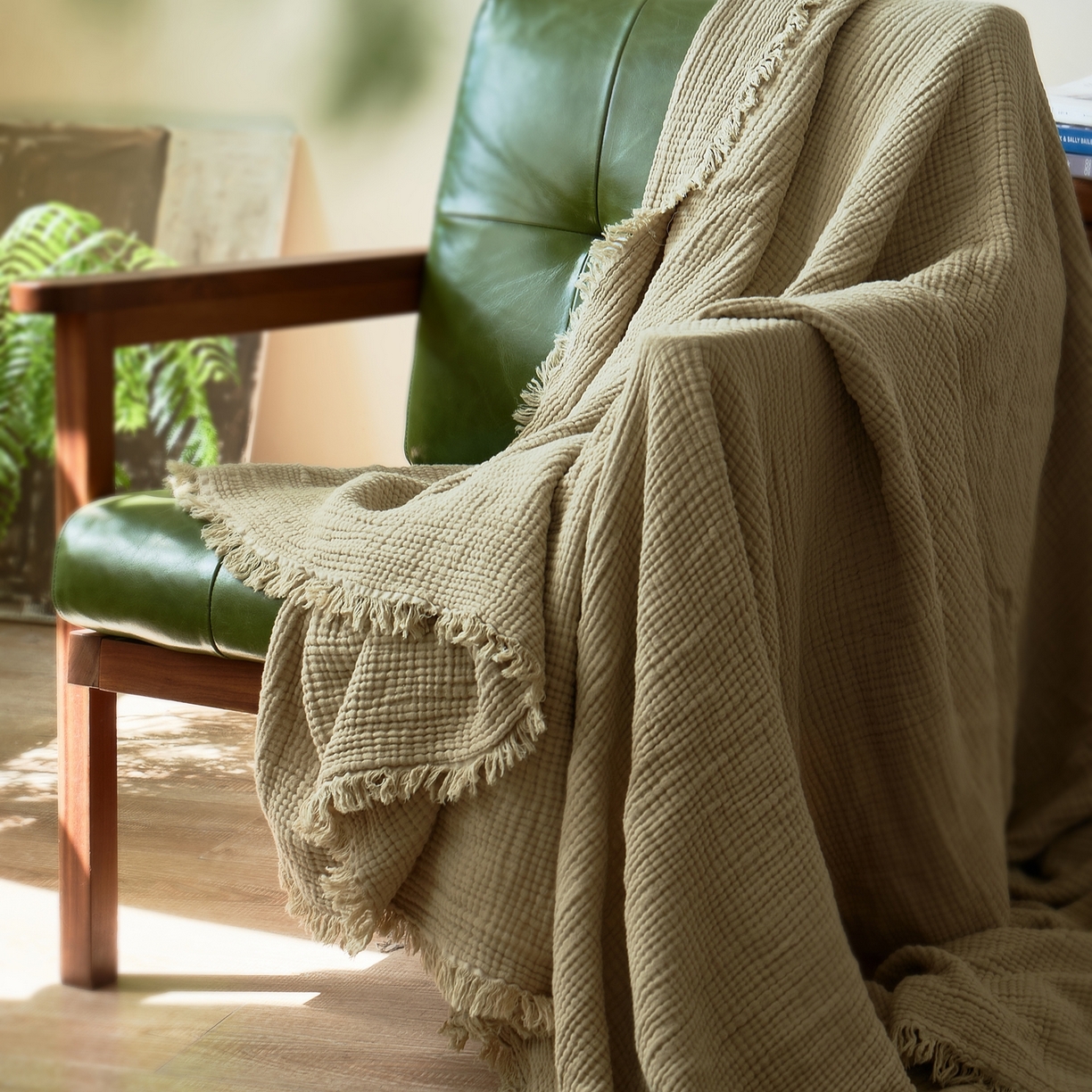 Wrap yourself in everyday comfort with this beautifully crafted solid color cotton tassel blanket. Made from four-layer muslin gauze cotton, it feels soft, breathable, and gently textured against the skin. The pleated design and hand-finished tassels on all four sides add a relaxed yet refined look that instantly elevates any space. Whether draped over a sofa, layered at the end of a bed, or used as a light cover, this blanket blends function with effortless style.