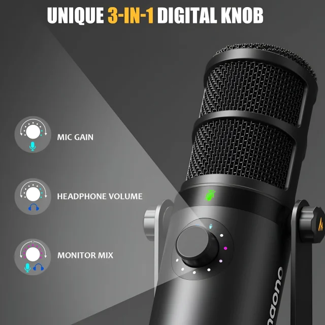 Take full control of your sound with intuitive, easy-to-use features. The one-touch mute button lets you silence your mic instantly, while the multi-function knob allows you to adjust mic gain, headphone volume, and monitoring mix. Real-time LED indicators show your levels at a glance, so you can focus on creating, not troubleshooting. Plus, the built-in 3.5mm headphone jack provides zero-latency monitoring for precise control of your sound.