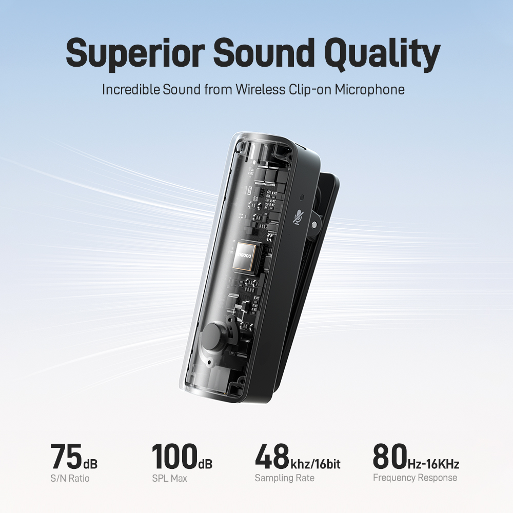 This versatile clip-on microphone adapts to every scenario—vlogs, interviews, weddings, meetings, classes, or live performances. Its matte texture finish keeps it sleek and smudge-free, while the lightweight design ensures comfort throughout your shoot. Wherever your creativity takes you, this wireless mic kit makes capturing premium sound effortless.