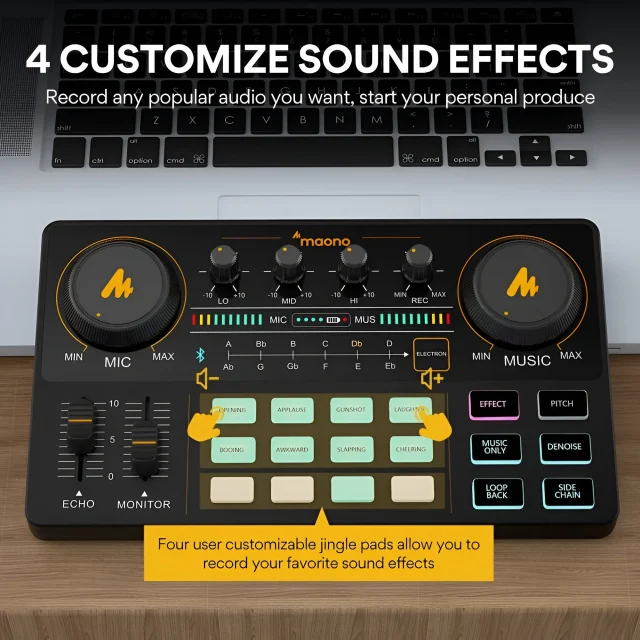 This versatile podcast studio combines advanced sound control with easy-to-use functionality. With 8 built-in sound effects, 4 custom sound slots, and a pitch changer, you can instantly add fun, creativity, and personality to your streams. It supports multiple devices and users at once, making it ideal for interviews or group shows. Plus, Bluetooth connectivity allows you to play background music wirelessly while you record.