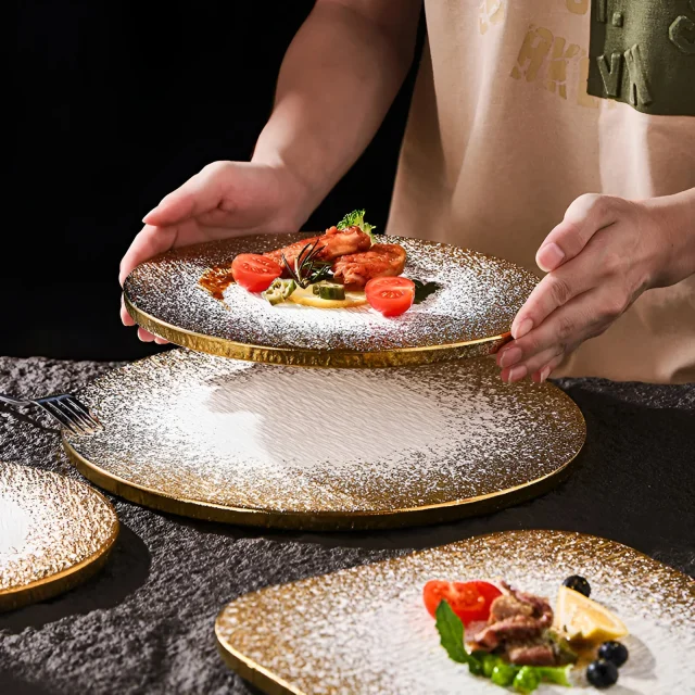 What makes this plate truly special is its subtle luxury. The gold-frosted edging creates a warm shimmer that instantly enhances table settings for celebrations, romantic dinners, and special occasions, yet its minimalist design keeps it suitable for everyday meals. It’s ideal for restaurants aiming to elevate presentation and for home cooks who enjoy serving dishes that look as good as they taste.