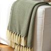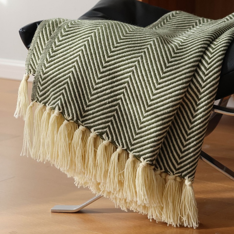 Bring calm, cozy style into your home with this minimalist herringbone knit throw blanket in a timeless olive green tone. Designed to look beautiful while feeling incredibly soft, this throw adds warmth, texture, and character to any sofa, bed, or favorite chair. The subtle geometric weave and delicate tassel edges create a refined, European-inspired look that blends easily with modern, rustic, or classic interiors.