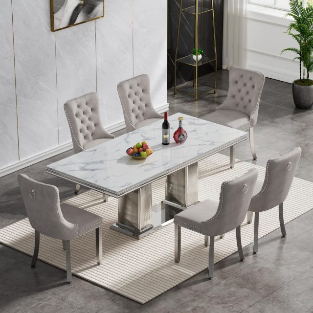 • Spacious Faux Marble Table: The 70-inch long table features a durable white marble-patterned top supported by a stunning 8K mirrored stainless steel base that reflects light beautifully.