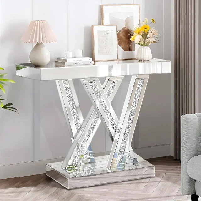 Transform your entryway or living area with this stunning Modern Silver Mirrored Console Table featuring a luxurious crushed diamond inlay. Designed to catch the eye and reflect light beautifully, this elegant hallway table adds a touch of glamour to any home. Its sleek mirrored surface and trendy W-shaped leg design blend effortlessly with both modern and contemporary interiors, creating a statement piece that impresses at first glance.