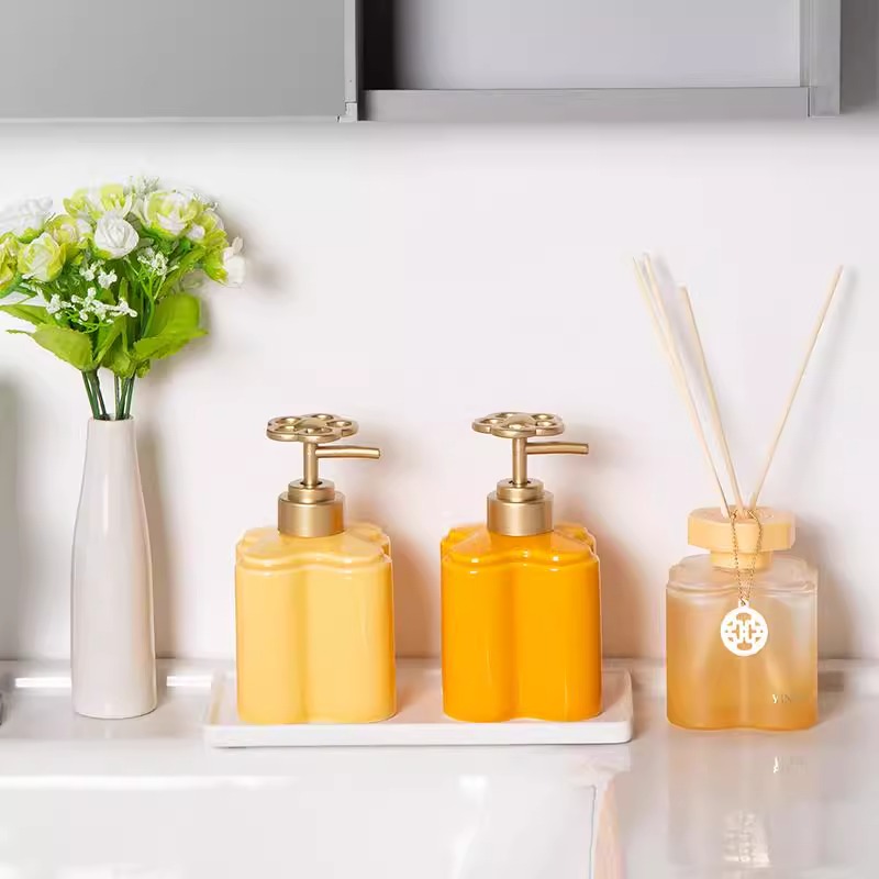 Modern Orange Floral Ceramic Lotion Bottle Bathroom Toilet Hand Sanitizer Shampoo Water Bottle Press Soap Dispenser Empty Bottle