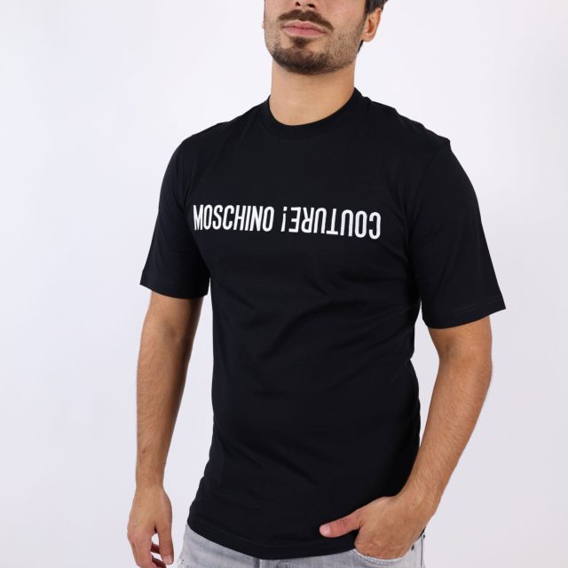 This T-shirt features a classic round neckline and short sleeves, perfect for easy wear. Crafted from 100% pure cotton, it provides a breathable, soft feel against the skin. The high-quality fabric not only delivers comfort but also ensures durability, making it a staple piece for your everyday collection. Designed in a sleek black shade with a bold printed pattern, it embodies the modern edge Moschino is known for.