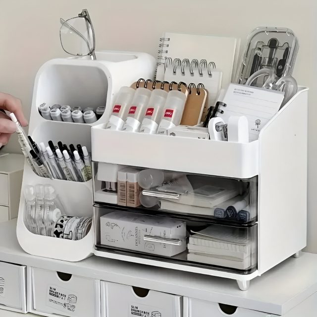 Made from durable plastic, this organizer is lightweight yet sturdy enough for everyday handling. Multiple compartments hold pens, pencils, markers, scissors, and other small office tools, while the smooth-sliding drawer is ideal for paper clips, erasers, sticky notes, and other small accessories. What makes this product special is how it combines open storage with concealed space, giving you a cleaner-looking desk in seconds.
