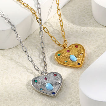 Opal Colored Zircon Heart Pendant Necklace – Waterproof Stainless Steel Gold Plated