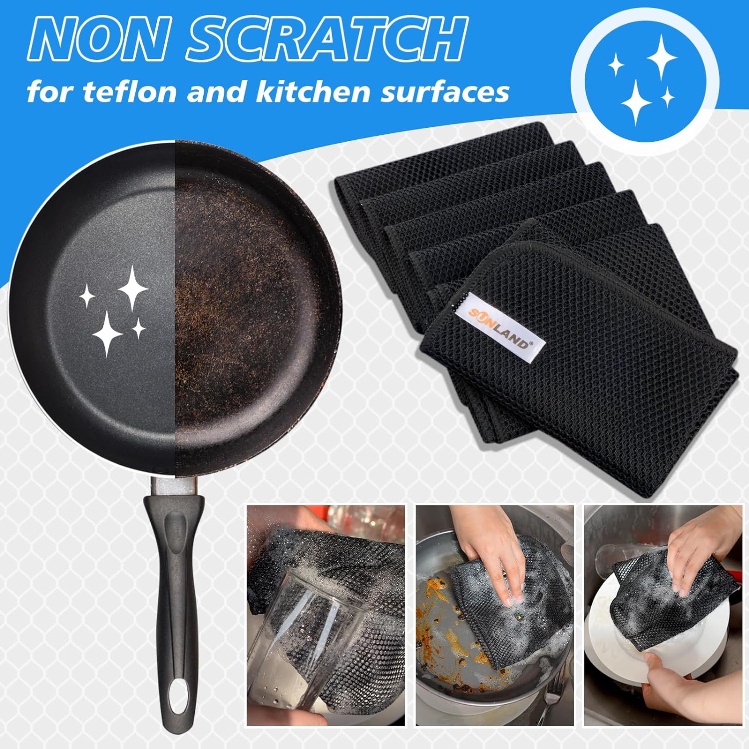 The large netted design lets food particles pass right through, preventing the buildup that causes unpleasant smells. Unlike traditional sponges, these cloths dry quickly and stay fresh longer, giving you a cleaner, healthier kitchen. Plus, they’re safe to use on almost any surface—so you can scrub pots, pans, non-stick cookware, stainless steel, copper, chrome, and even delicate ceramics without worry.