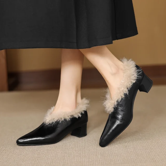 Step into winter with confidence and effortless style. These retro-inspired pointed toe loafers are designed for women who love timeless fashion with everyday comfort. Made from high-quality split leather and finished with elegant stitching details, they bring a refined look that instantly upgrades casual outfits. The sleek pointed toe adds a feminine edge, while the mid-height heel offers just the right lift without sacrificing comfort.
