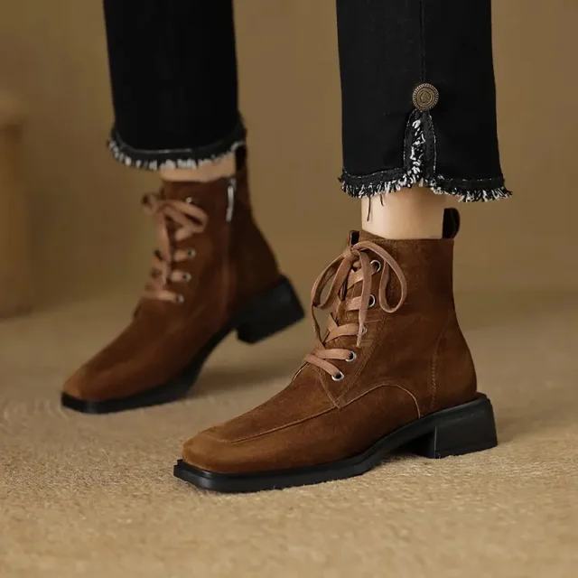 Suede Lace-Up Square Toe Chunky Heel Women’s Short Boots