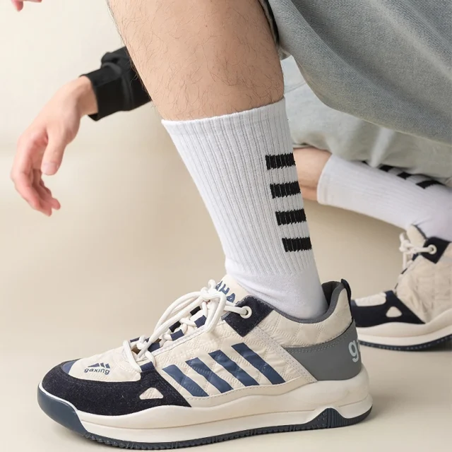 Made from a comfortable blend of cotton and polyester, these socks provide just the right amount of stretch and breathability. Their soft, cushioned feel ensures comfort all day, while the sleek black and white stripes bring a bold, modern touch to any look. With a range of colors like red, blue, gray, green, and purple, you can easily mix and match to express your unique style.