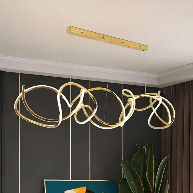 Crafted from durable aluminum and finished with a luxurious electroplated coating, this hanging lamp embodies modern minimalism at its finest. Measuring approximately 47 inches in length and 13.8 inches in height, it offers balanced proportions for both small and large spaces. The adjustable suspension wire (up to 59 inches) allows you to customize the height for the perfect fit in any setting.