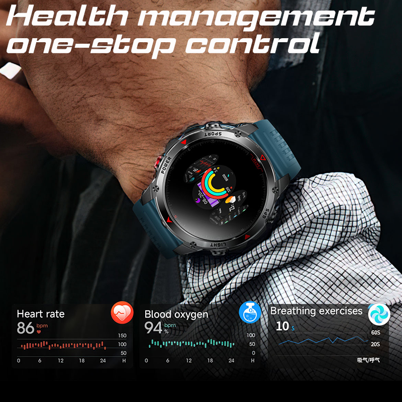 Meet the ultimate companion for your active lifestyle. This military-inspired outdoor sports smartwatch is built for movement, exploration, and everyday performance. With a crisp 1.46-inch round HD display, built-in GPS, and a fully waterproof design, it gives you reliable tracking and clear visibility whether you’re hiking rugged trails, training at the gym, or navigating your day. What makes it special? It blends toughness, smart technology, and advanced wellness monitoring into one sleek device that works for both men and women.