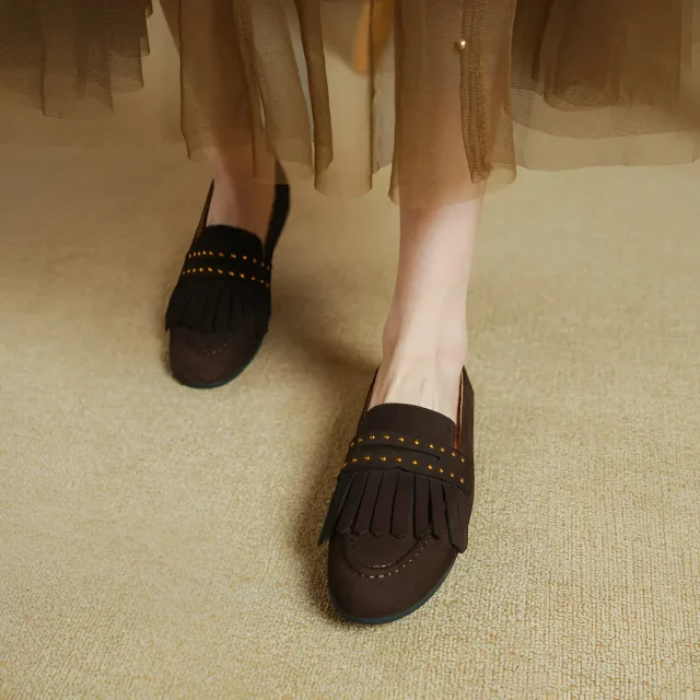 Step into confidence with these beautifully crafted women’s loafers designed for daily wear. Made from genuine leather inside and out, they deliver a soft, breathable feel that keeps your feet comfortable from morning to night. The classic round toe creates a timeless silhouette, while elegant tassels and subtle rivet details add a modern, fashionable touch. These loafers are perfect for women who want polished style without sacrificing comfort.