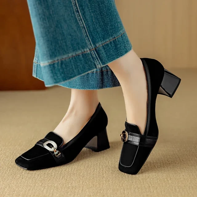 Step into confidence with these elegant women’s loafers designed to elevate your everyday look. Crafted from soft sheep suede leather with a smooth, refined finish, these slip-on pumps blend timeless style with modern comfort. The square toe shape gives them a chic, fashion-forward edge, while the chunky heel adds just the right amount of lift without sacrificing stability. Perfect for women who want shoes that feel as good as they look.
