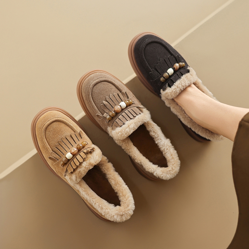 With their slip-on style, you can easily wear these loafers when you’re on the go. The addition of the playful tassels adds a subtle flair, making them perfect for dressing up or down depending on your outfit. Choose between chocolate, light brown, and khaki colors to find the perfect match for your winter wardrobe. These loafers are versatile enough to pair with jeans, skirts, or even casual dresses, making them a must-have for your seasonal collection.
