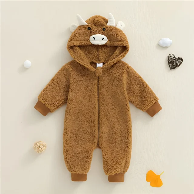 Adorable Baby Bull Plush Hooded Romper – Cozy Winter Jumpsuit