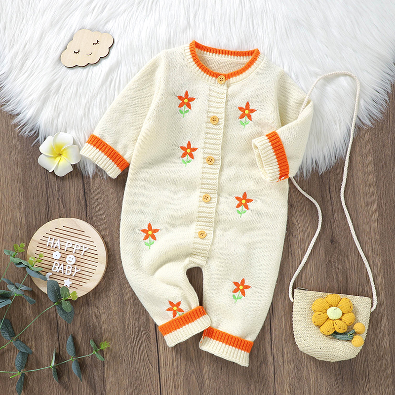 Every parent wants clothing that is both practical and adorable, and this romper delivers exactly that. The embroidered floral pattern brings a unique charm that sets it apart from everyday basics. The knit fabric adds warmth without heaviness, making it ideal for adventures. Whether worn at home or out and about, your baby will look cute and feel comfortable.