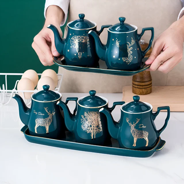 Bring a touch of refined charm to your kitchen or dining space with the Nordic Emerald Ceramic Oil & Vinegar Bottle Set. Handcrafted with precision and painted in a rich emerald hue accented by gold-painted elk motifs, this elegant set is more than a kitchen tool—it’s a piece of art. Perfect for home cooks and professional chefs alike, it beautifully combines function and sophistication, turning your everyday meals into elevated culinary moments.