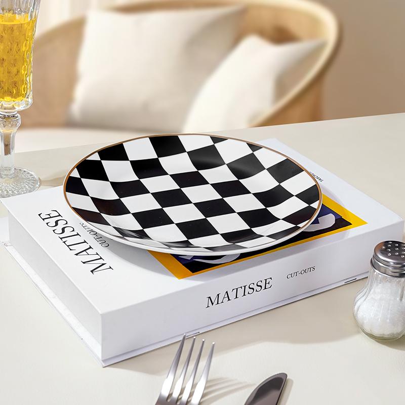 Add a touch of modern elegance to your table with this stunning plaid ceramic plate. Featuring a bold black and white checkered pattern and finished with a delicate golden edge, this round plate is designed to turn everyday snacks and desserts into a stylish presentation. Its timeless design blends classic charm with contemporary flair, making it a versatile choice for any home.