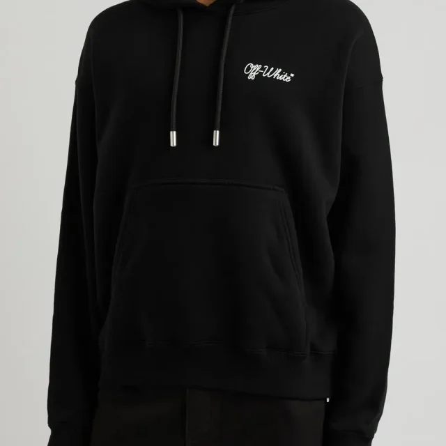 The front kangaroo pocket offers practicality with a sleek design, providing a perfect spot to stash your essentials or keep your hands cozy. The real eye-catcher, however, is the iconic Off-White branding—boldly displayed through a contrasting monogram on the front and a striking maxi monogram print on the back. It’s impossible not to stand out in this hoodie, making it a must-have for anyone who loves to combine style with comfort.