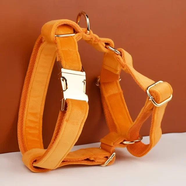 Give your furry friend the perfect blend of style, safety, and comfort with our Orange Velvet Dog Collar and Leash Set. Made with soft velvet fabric, this set adds a touch of elegance while keeping your pup comfortable during every walk. The vibrant orange color makes your dog stand out, ensuring they look adorable and stylish wherever they go.
