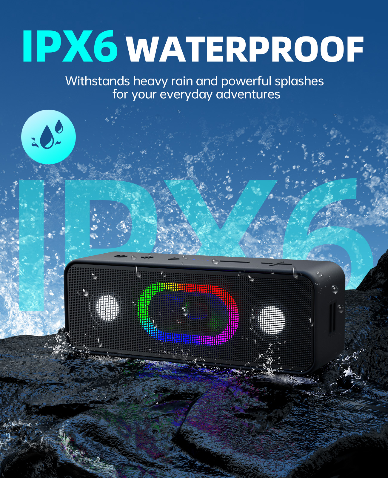 • IPX6 Waterproof Protection – Ideal for outdoor use, rain, or poolside parties.