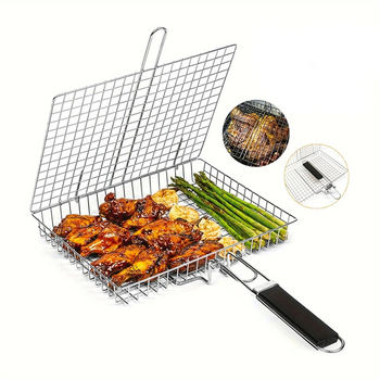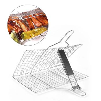 Folding Stainless Steel BBQ Grill Basket with Handle for Fish, Vegetables & Shrimp