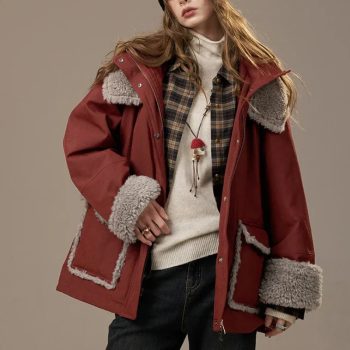 Women’s Winter Plush Panel Lapel Puffer Jacket – Loose Fit