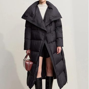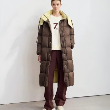 Long Winter Down Coat with Detachable Hood & Contrast Lining