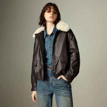 Oversized PU Leather Winter Jacket with Fleece Collar in Coffee Brown