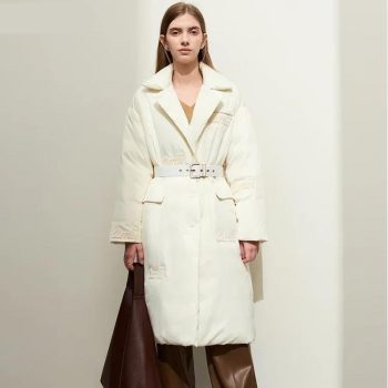 Women’s Long Belted Down Coat with Suit Collar & Embroidered Details