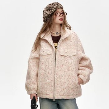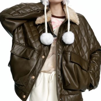 Diamond Checkered Plush-Look Short PU Jacket for Women