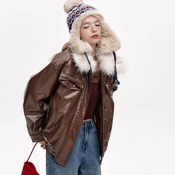 Plush Collar Spliced PU Thick Warm Coat for Women