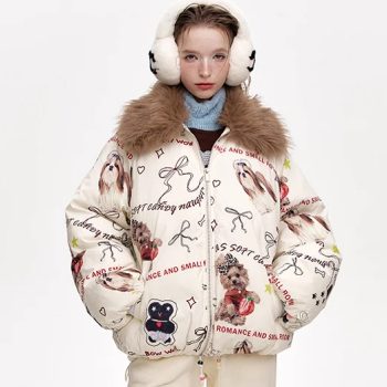 Retro Puppy Print Short Faux Fur Collar Jacket