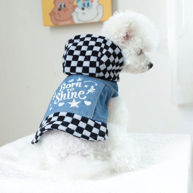 Pet Plaid Hooded Sweatshirt with Denim Splicing – Stylish Dog Coat for Small Dogs
