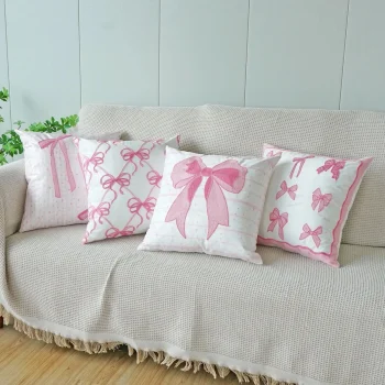 Pink Bow Embroidered Flannel Cushion Cover 18x18in Soft Decorative Pillowcase